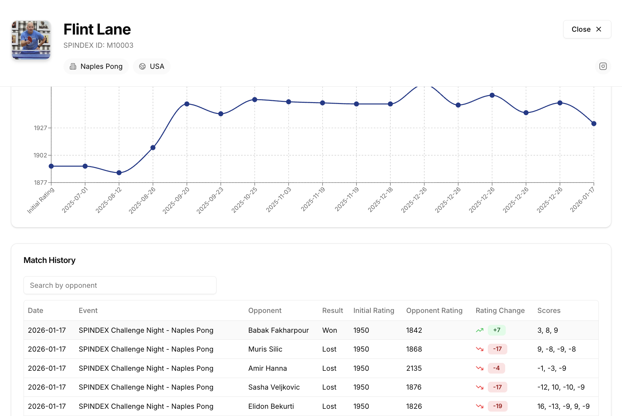 A player's SPINDEX rating travels with them across clubs, cities, and events. Every certified match adds to their record.